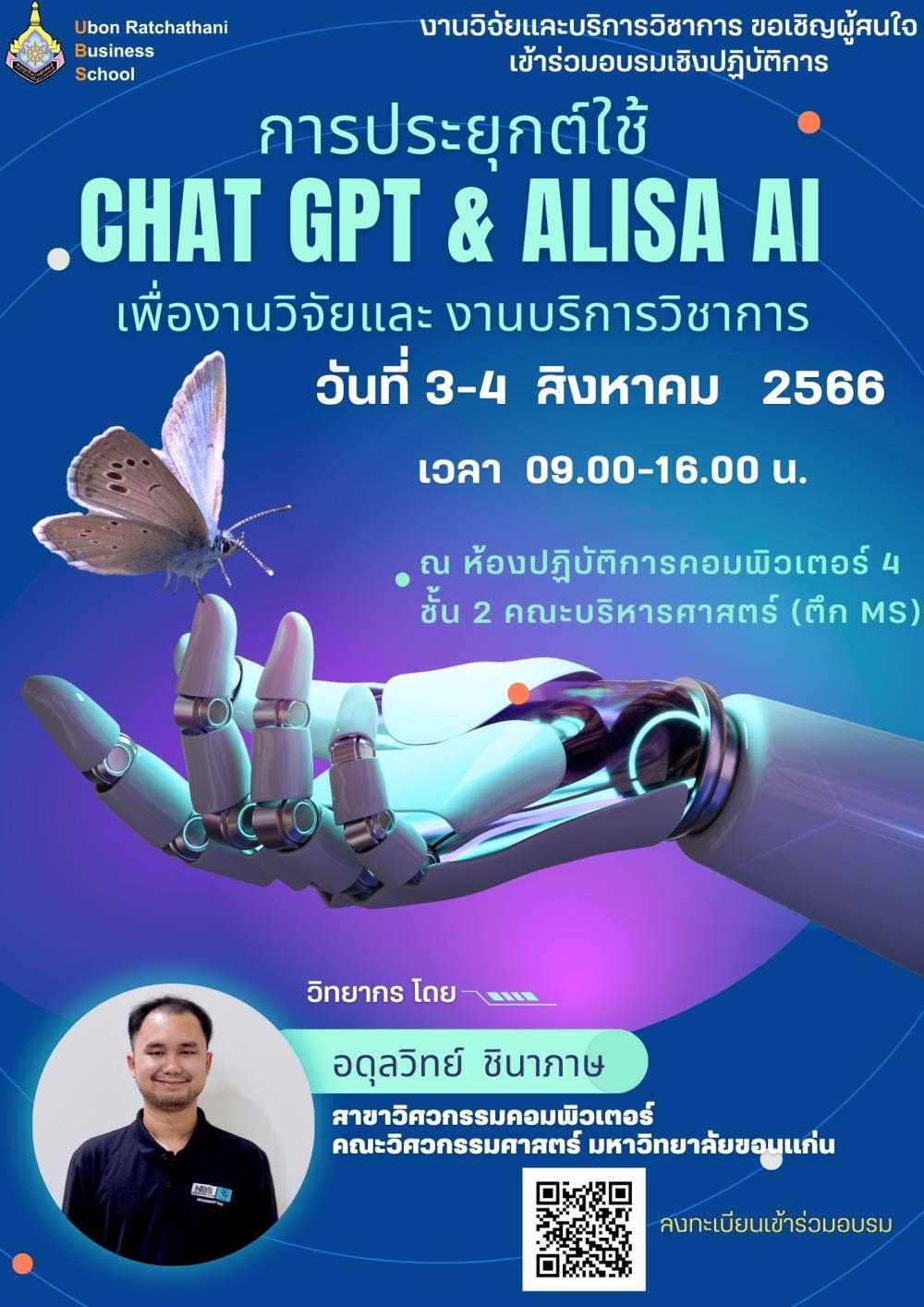 งานวิจัยและบริการวิชาการ คณะบริหารศาสตร์ จัดอบรม หัวข้อ “การประยุกต์ใช้ Chat GPT และ Alisa AI เพื่องานวิจัยและงานบริการวิชาการ” เมื่อวันที่ 3-4 สิงหาคม 2566 เป็นการเรียนรู้และพัฒนาทักษะการใช้เครื่องมือ AI เสริมศักยภาพในการทำวิจัย และงานบริการวิชาการ ให้แก่คณาจารย์ โดยได้รับเกียรติจาก คุณอดุลวิทย์ ชินาภาษ Ph.D. Student ,Computer Engineering, Khon Kaen University และ Data Science Engineer, HG Robotics co., ltd.