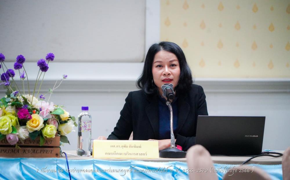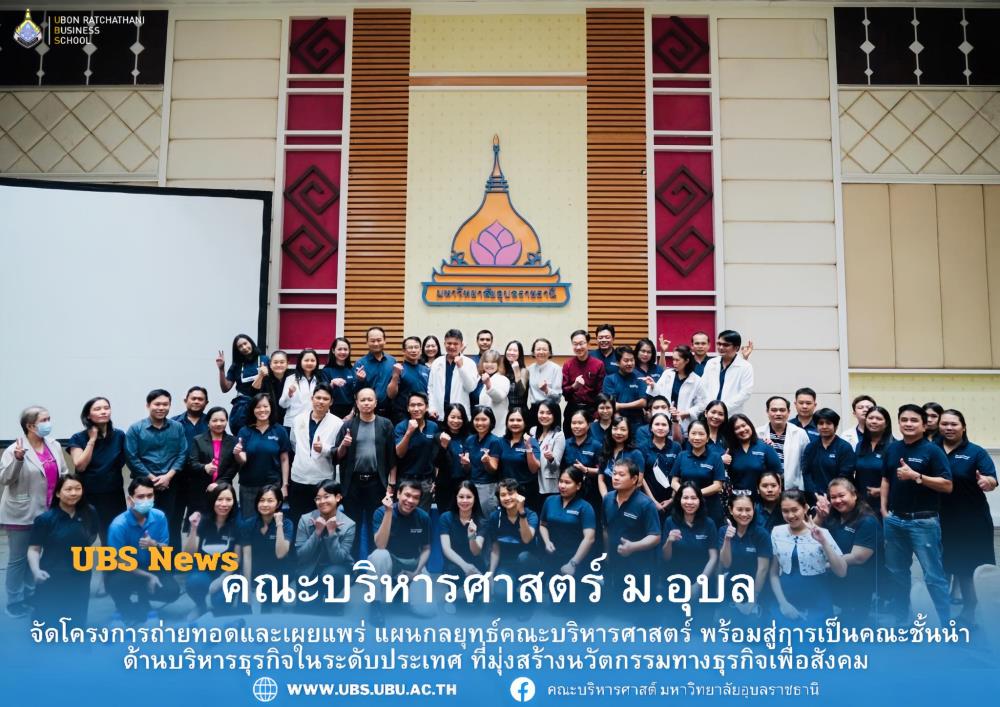 คณะบริหารศาสตร์ มหาวิทยาลัยอุบลราชธานี พร้อมมากที่จะผลิตบัณฑิตที่มีคุณภาพออกไปรับใช้สังคม ภายใต้ วิสัยทัศน์ "คณะชั้นนำด้านบริหารธุรกิจในระดับประเทศ ที่มุ่งสร้างนวัตกรรมทางธุรกิจเพื่อสังคม" ภายใต้ค่านิยมองค์กร U-BEST U = Unity สามัคคี กลมเกลียว เป็นหนึ่งเดียว B = Business Value Creation คิดสร้างคุณค่าทางธุรกิจ E = Excellent Service for Customers and Stakeholders มุ่งเน้นการบริการที่เป็นเลิศเพื่อผู้เรียนและผู้มีส่วนได้เสีย S = Social Responsibility รับผิดชอบต่อสังคม T = Technology and Innovation Focus มุ่งเน้นเทคโนโลยีและนวัตกรรม วันที่ 7 กันยายน 2566 ผู้ช่วยศาสตราจารย์ ดร. อุทัย อันพิมพ์ คณบดีคณะบริหารศาสตร์ ได้ถ่ายทอดและเผยแพร่แผนกลยุทธ์ คณะบริหารศาสตร์ พ.ศ. 2566-2570 (ฉบับปรับปรุง 2566) ต่อคณาจารย์และบุคลากรคณะบริหารศาสตร์เพื่อสร้างการรับรู้และความเข้าใจร่วมกันในการขับเคลื่อนคณะไปสู่เป้าหมาย ณ ห้อง Ballroom C ชั้น2 โรงแรม U-Place UBS is U-BEST