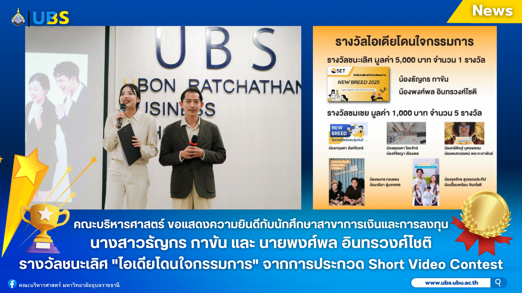 คณะบริหารศาสตร์ ขอแสดงความยินดีกับ นางสาวธัญกร กาขัน และ นายพงศ์พล อินทรวงศ์โชติ นักศึกษาสาขาการเงินและการลงทุน ที่คว้ารางวัลชนะเลิศ ประเภท "ไอเดียโดนใจกรรมการ" จากการประกวด Short Video Contest หัวข้อ "ทำไมคนรุ่นใหม่ต้องเข้า โครงการ New Breed 2025" พร้อมรับเงินรางวัล 5,000 บาท!