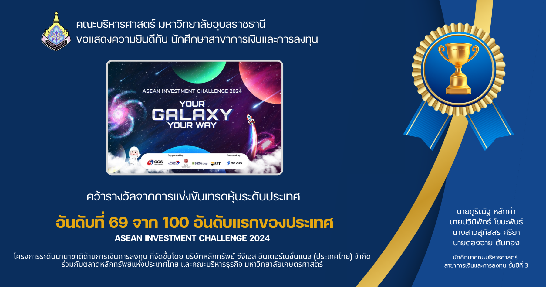 คณะบริหารศาสตร์ มหาวิทยาลัยอุบลราชธานี ขอแสดงความยินดีกับนักศึกษาชั้นปีที่ 3 สาขาการเงินและการลงทุน ทีม Bear Busters ได้แก่ นายภูริณัฐ หลักคำ นายปวินิพัทธ์ โขมะพันธ์ นางสาวสุภัสสร ศรียา นายตองฉาย ต้นทอง ทั้ง 4 คนได้เข้าร่วมการแข่งขัน ASEAN Investment Challenge 2024 ซึ่งเป็นเวทีระดับนานาชาติด้านการเงินและการลงทุน จัดโดย บล.ซีจีเอส อินเตอร์เนชั่นแนล (ประเทศไทย) ร่วมกับตลาดหลักทรัพย์แห่งประเทศไทย และคณะบริหารธุรกิจ ม.เกษตรศาสตร์ ในปี 2024 มีผู้เข้าร่วมกว่า 5,379 คน จาก 4 ประเทศอาเซียน โดยมีผู้เข้าแข่งขันในประเทศไทยจำนวน 849 คน จาก 30 มหาวิทยาลัยทั่วประเทศ ทีมจาก ม.อุบลฯ สามารถคว้าอันดับที่ 69 จาก 100 อันดับแรกของประเทศ สะท้อนศักยภาพของนักศึกษาคณะบริหารศาสตร์ในการวางแผนกลยุทธ์และการลงทุนอย่างมีประสิทธิภาพ การแข่งขันนี้เน้นแนวคิด ESG (Environment, Social, Governance) ส่งเสริมการลงทุนอย่างยั่งยืน พร้อมเปิดโอกาสให้ผู้ชนะได้เข้าร่วมแข่งขันระดับภูมิภาคที่ประเทศมาเลเซีย ชิงเงินรางวัลรวมกว่า 900,000 บาท
