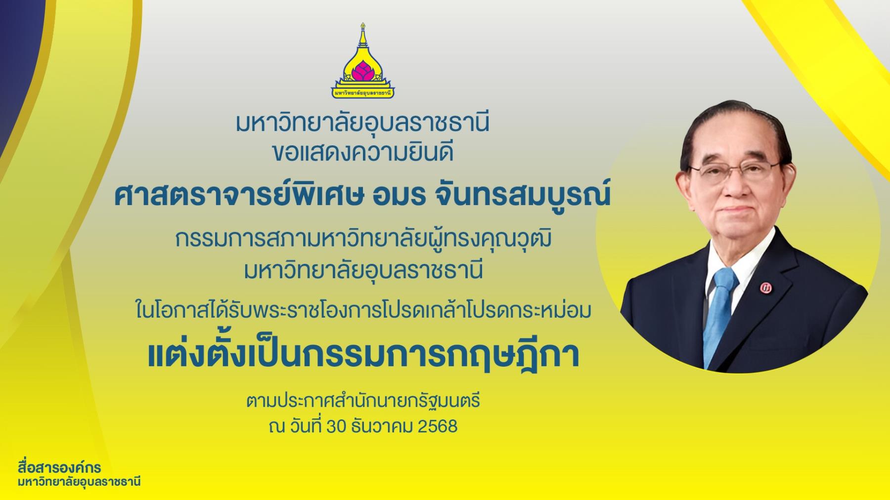 ศาสตราจารย์พิเศษ อมร จันทรสมบูรณ์ กรรมการสภามหาวิทยาลัยผู้ทรงคุณวุฒิ มหาวิทยาลัยอุบลราชธานี ในโอกาสได้รับพระราชโองการโปรดเกล้าโปรดกระหม่อมแต่งตั้งเป็นกรรมการกฤษฎีกา ตามประกาศสำนักนายกรัฐมนตรีณ วันที่ 30 ธันวาคม 2568