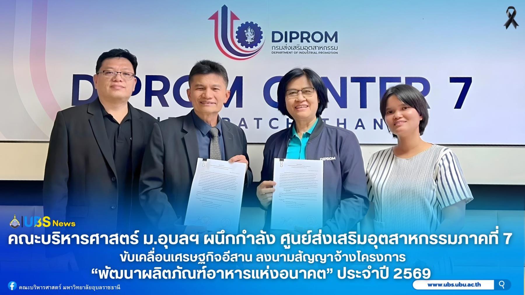 วันที่ 25 ธันวาคม 2568 คณะบริหารศาสตร์ มหาวิทยาลัยอุบลราชธานี เดินหน้าพันธกิจบริการวิชาการเพื่อสังคม นำโดย ผู้ช่วยศาสตราจารย์ ดร.อุทัย อันพิมพ์ คณบดีคณะบริหารศาสตร์ พร้อมด้วย ดร.ดุสิต จักรศิลป์ รองคณบดีฝ่ายวิจัยและบริการวิชาการ ร่วมพิธีลงนามในสัญญาจ้างดำเนินกิจกรรม “การพัฒนาผลิตภัณฑ์อาหารแห่งอนาคต (Future Food)” ประจำปีงบประมาณ 2569 ณ ศูนย์ส่งเสริมอุตสาหกรรมภาคที่ 7 จังหวัดอุบลราชธานี